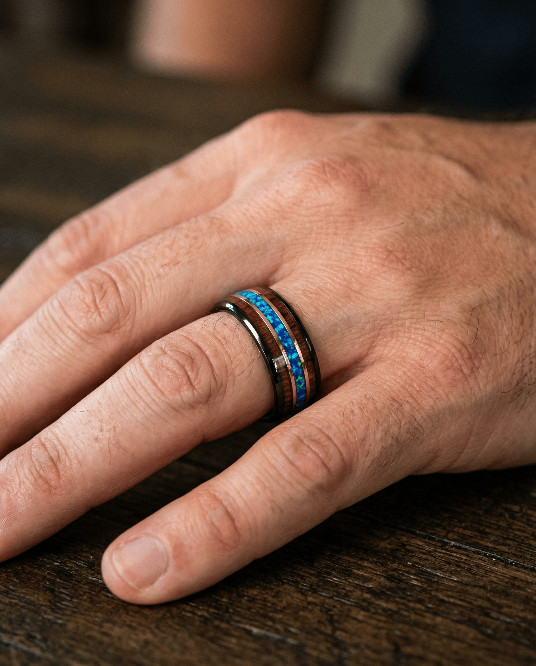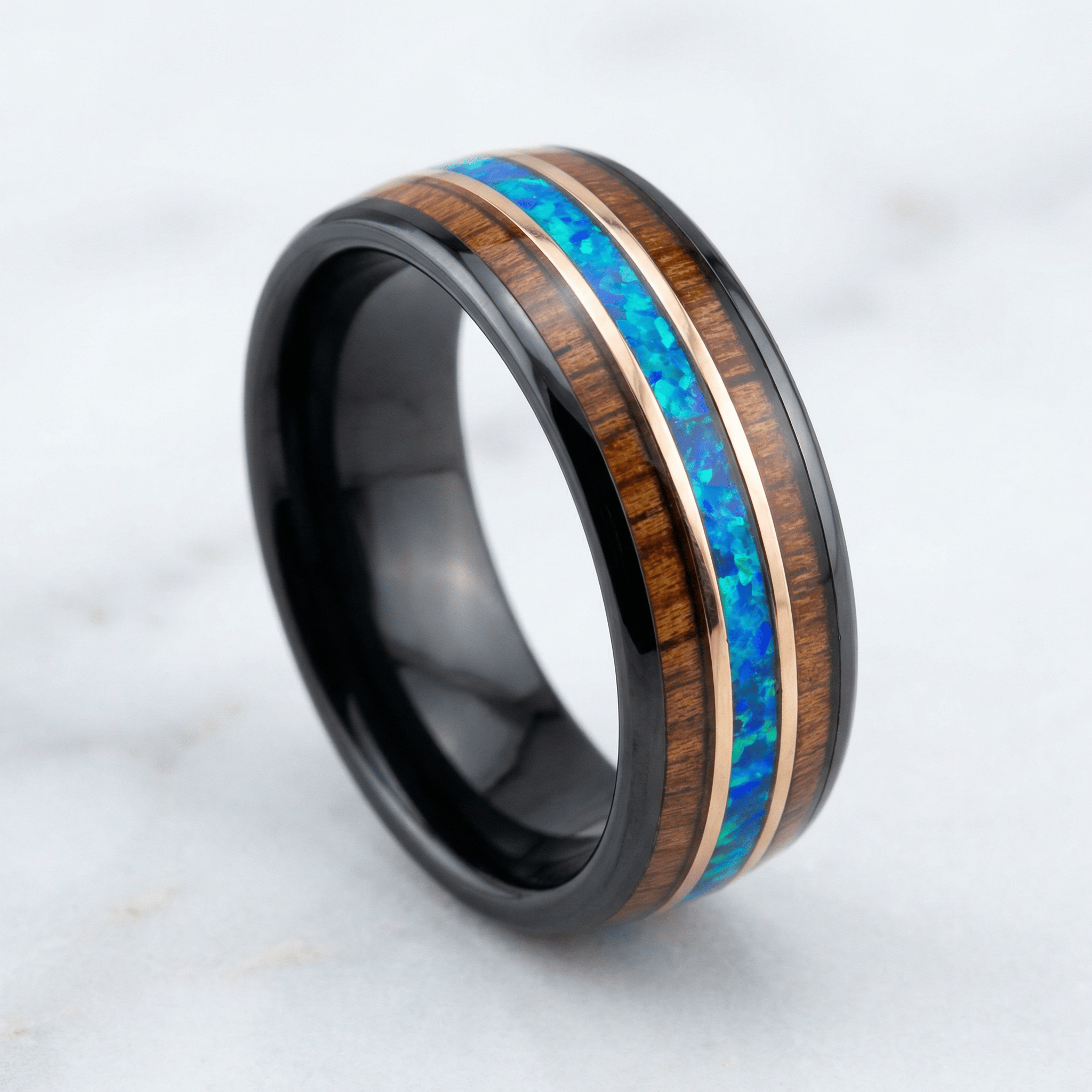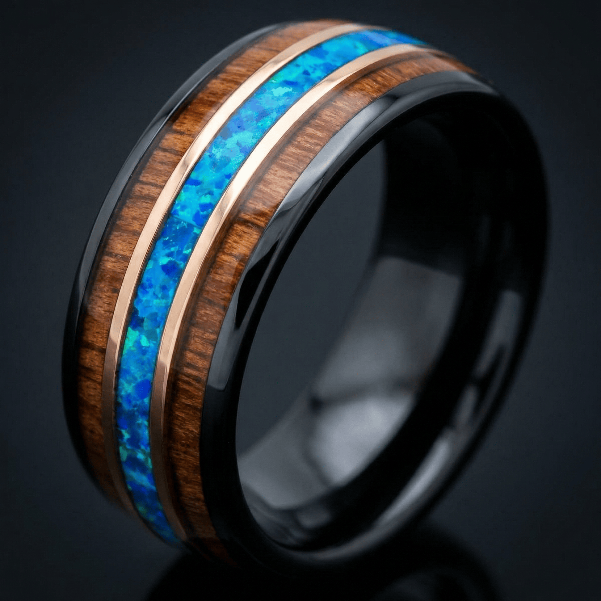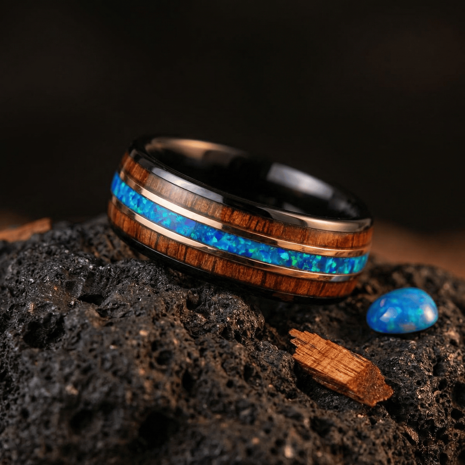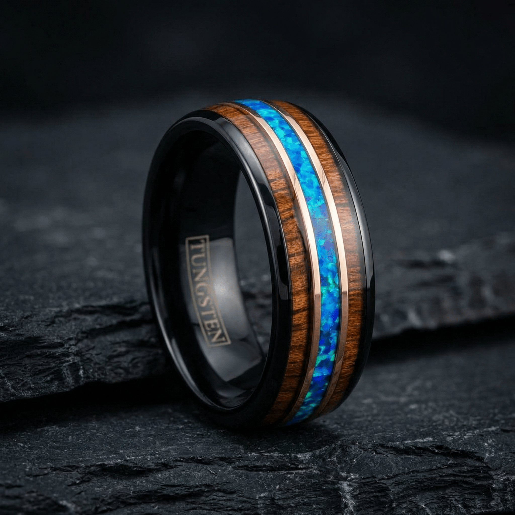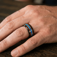Der Odin repräsentiert die Stärke und Schönheit der nordischen Mythologie und verkörpert die Weisheit und Kraft seines Namensgebers. Das polierte schwarze Wolfram symbolisiert Widerstandsfähigkeit, während die leuchtende Einlage aus zerstoßenem Hawaii-Blauopal einen Hauch natürlicher Schönheit verleiht. Die Rosenbänder und Koaholz-Einlagen werten das Design zusätzlich auf und spiegeln eine raffinierte Eleganz und die tiefe Verbundenheit mit alten Traditionen wider.